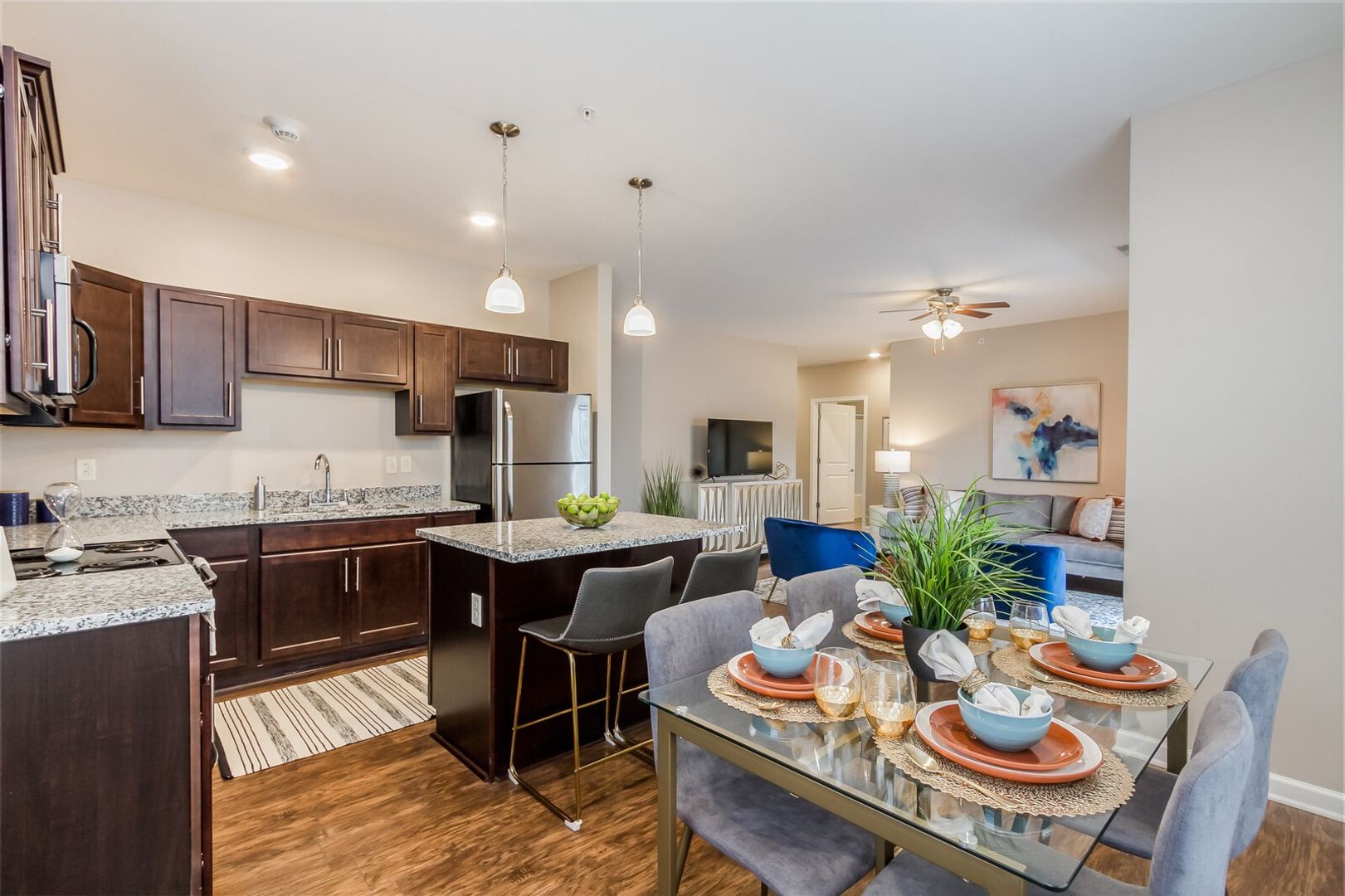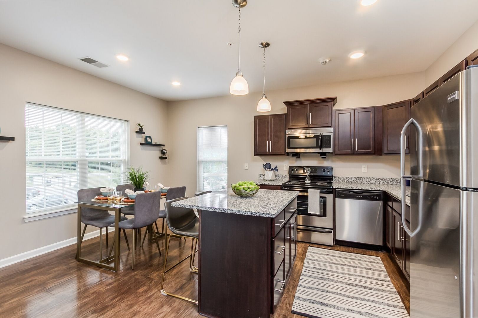 Make yourself at home in this beautiful, contemporary-designed three-bedroom, two bathroom apartment home! Recently built in 2017, this unit features luxury vinyl tile flooring, granite countertops, kitchen island with breakfast bar, in-unit washer and dryer, master bathroom with his and hers vanities, large walk-in closets and personal patio/balcony. The subtle color palettes and use of natural materials create a living environment that is stylish, comfortable, and complementary to any decor!